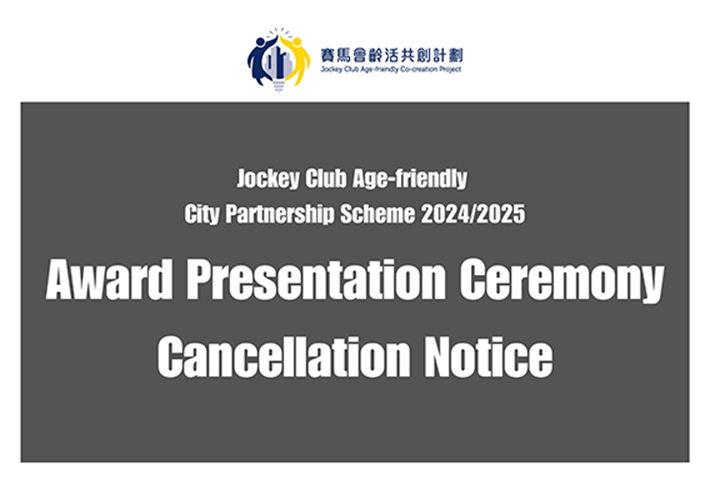 After careful consideration, we have decided to cancel the Jockey Club Age-friendly City Partnership Scheme 2024/2025 Award Presentation Ceremony, which was originally scheduled for tomorrow (28 November 2025).